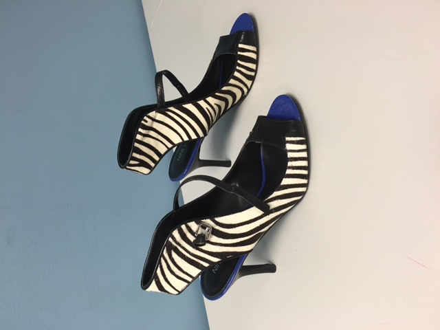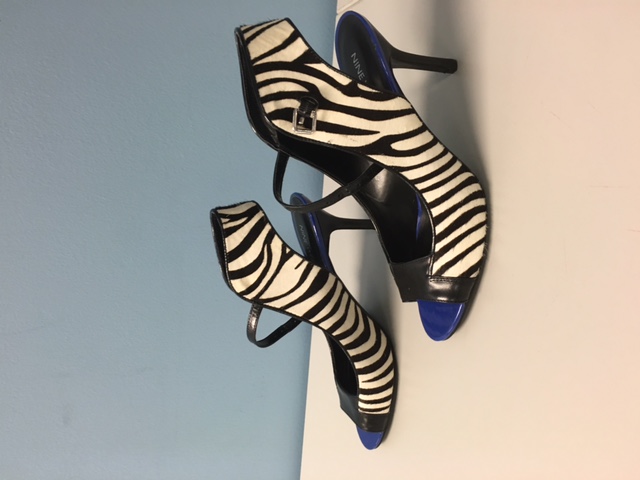 One day at T.J. Maxx, Janice happened upon a pair of hot heels by Nine West: a short-hair zebra-print pair of open-toe heels with blue trim around the soles. They just happened to be in her size for just $40. She said, “They are so gorgeous, they could be put on a mantel over the fireplace,” (which is what she went there to look for in the first place). 😉