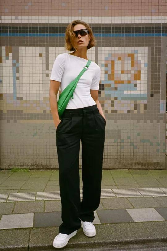 These trousers are made of a flowing material. Wearing your trousers with a t-shirt and sneakers is a super comfortable way to style them. There are lots of trousers made for lounging nowadays. Some are in comfy materials, others are cut in loose shapes and some are both.