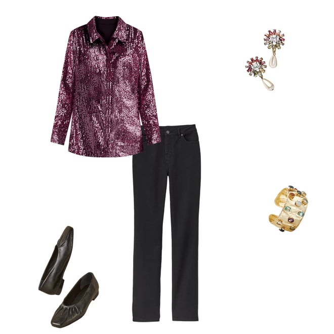 To go from day to evening, change your day top to a glittery one.