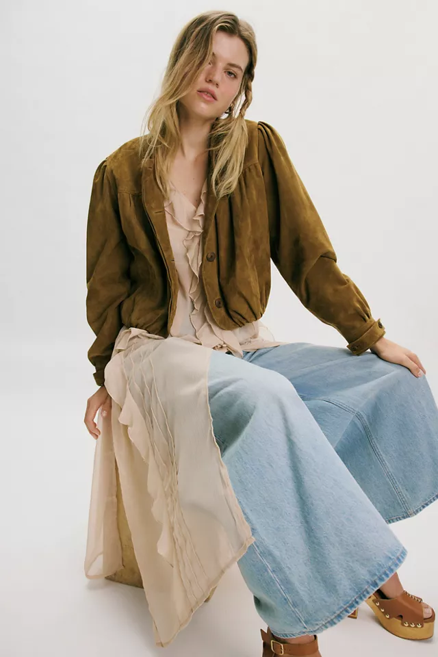 Replace the outfit formula of denim jacket over floral dress by switching to a suede jacket instead.