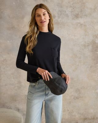 Weekender Mock-Neck Long-Sleeve Tee from Garnet Hill with jeans and a cap - Add a cap or other hat to a black or white tee & jeans.