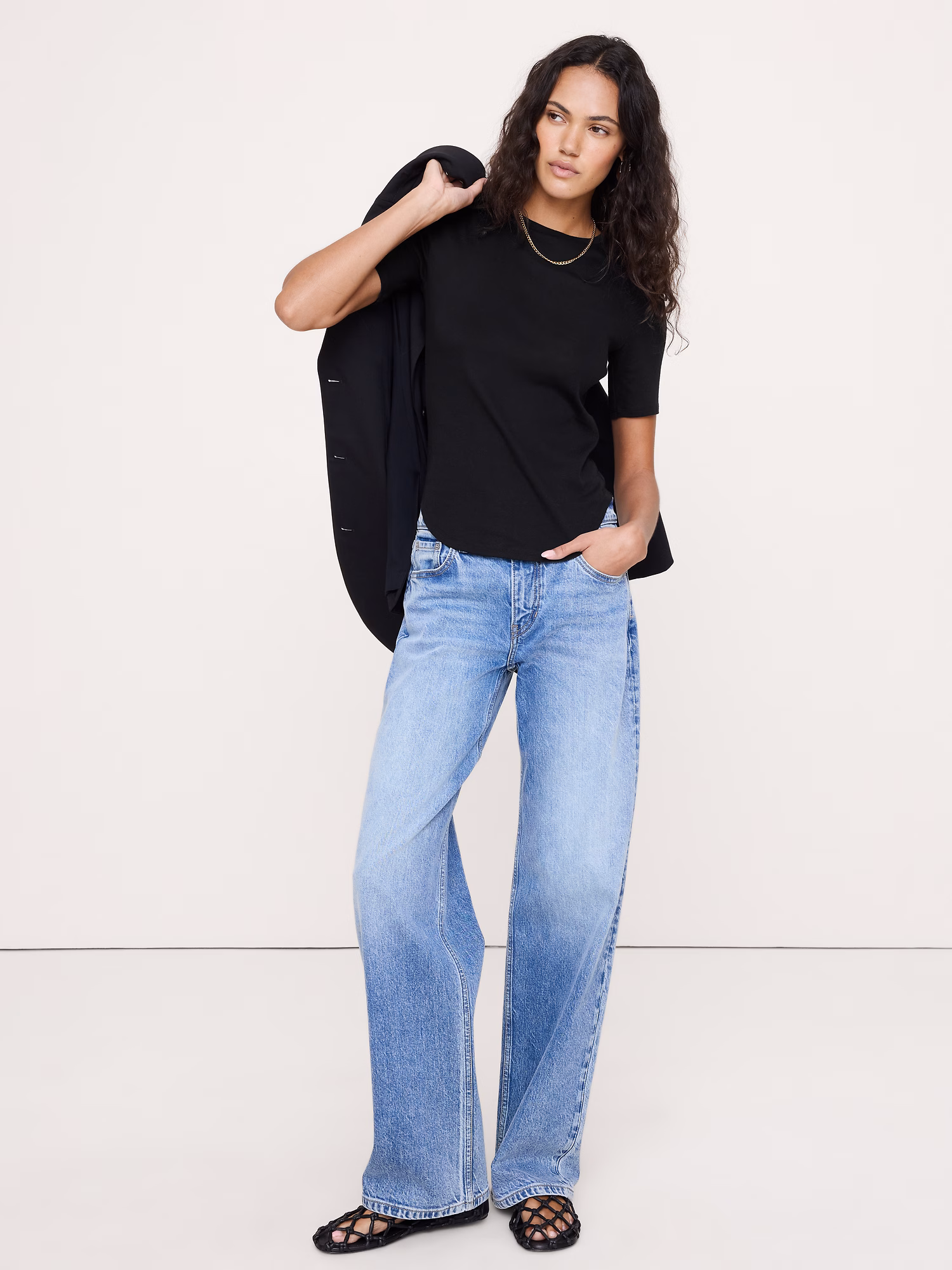 Airy Cotton Elbow-Sleeve T-Shirt from Banana Republic with a blazer, jeans, a gold chain and sandals - Throw a blazer over jeans & a tee. Layer gold necklaces. Add boots.
